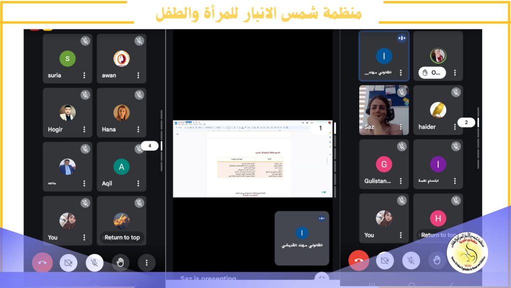 شاركت ” منظمة شمس الانبارللمرأة و الطفل ” في الورشة التدريبية الخاصة ( أعداد المدربين) عبر تطبيق [ كوكل ميت ] يوم الخميس الموافق 2024/4/25