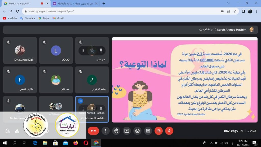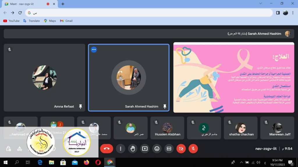فريق ومنصة ” أنبارنا أنباركم للسلام والمساواة ” جلسة توعوية الكترونية بعنوان :- ( أهمية الفحص المبكر والفحص الذاتي للوقاية من مرض السرطان ) عبر تطبيق الكوكل ميت _ يوم الثلاثاء الموافق 2023/10/17