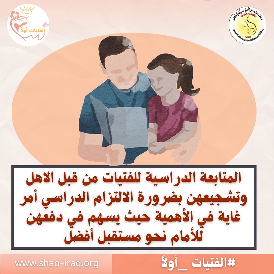 وتشجيعهن بضرورة الالتزام الدراسي أمر غاية في الأهمية حيث يسهم في دفعهن للأمام نحو مستقبل أفضل لهن ، والعكس في أبقاءهن بالمنزل ، يؤدي إلى انخفاض معدلات الإلمام بالقراءة والكتابة بين الإناث ، مما يعمل بمرور الزمن على تراجع الثقة بالنفس لدى الفتيات ، وأزدياد المشكلات السلوكية والقلق ، والسلوك العدواني ويمكن أن يمنع عدم القدرة على القراءة والفهم من الوصول إلى المستوى المتوقع منهم أثناء نموهم. ، ومن خلال حملة #الفتيات_أولاً التي تنفذها ” منظمة شمس الانبار للمرأة والطفل ” نساند وندعم جميع من يشجع ويدعم الفتيات للمضي نحو مستقبل أفضل لهن