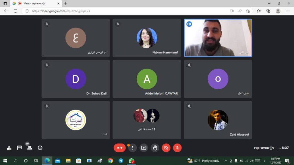 بعنوان ” تعزيز المعايير العادلة بين الجنسين من أجل تغييرات أساسية و دائمة للنساء و الفتيات ” التي نظمها فريق انبارنا انباركم للسلام والمساواة. باستخدام برنامج كوكل ميت ، يوم الاربعاء الموافق 2022/12/7 من الساعة الثامنة مساءً حتى الساعة العاشرة مساءً بتوقيت بغداد ، شارك بالجلسة عدد من المتحدثين والمتحدثات من دول مختلفة من الوطن العربي،
