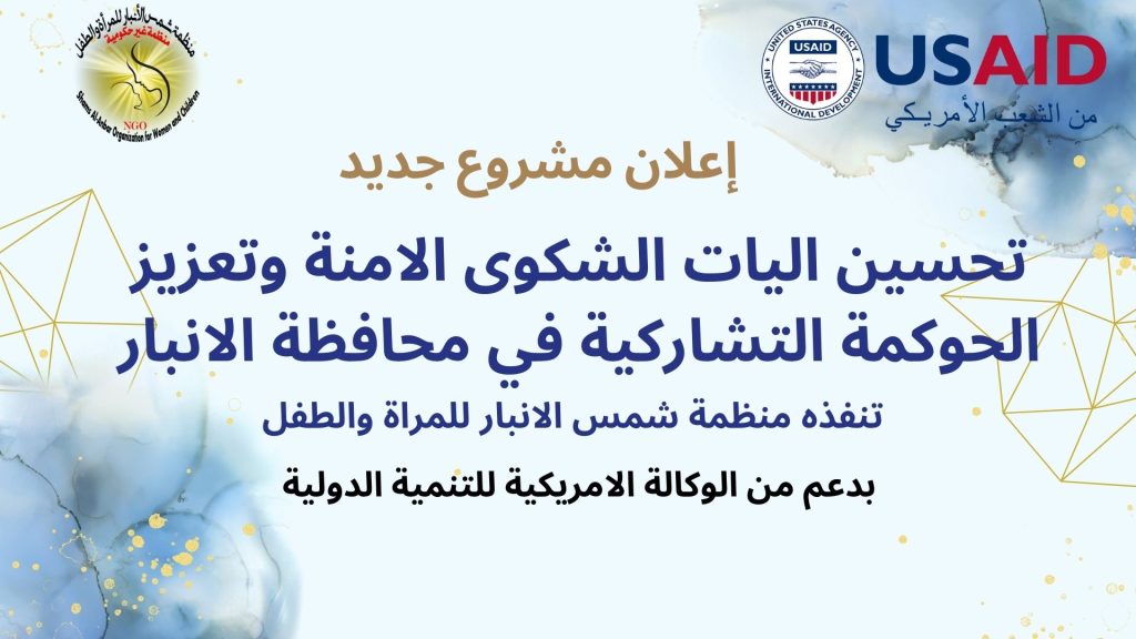 إعلان إطلاق مشروع جديد تعزيز الشراكة المجتمعية في محافظة الأنبار يسر منظمة شمس الأنبار للمرأة والطفل أن تعلن عن إطلاق مشروعها الجديد بعنوان تحسين آليات الشكوى الآمنة وتعزيز الحوكمة التشاركية بدعم من الوكالة الأمريكية للتنمية الدولية نظرة عامة على المشروع: يهدف هذا المشروع إلى تحسين جودة الخدمات الحكومية وتعزيز الشفافية والمساءلة من خلال إشراك المجتمع