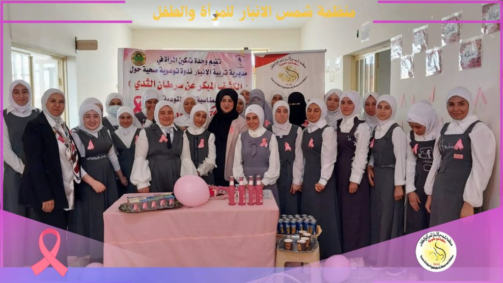 جلسة توعوية / أكتوبر الوردي / الانبار من مطلق القول القائل بحق المرأة [ يا زهرة الربيع وفتنة الدنيا وروح الحياة ، ايتها المرأة يا أحلى هدية خص الله بها الجمال ، يا ابهج شيءٍ في الحياة ]و تزامناً مع شهر أكتوبر الوردي ، المخصص للتوعية من مرض سرطان الثدي نفذت ” منظمة شمس الانبار
