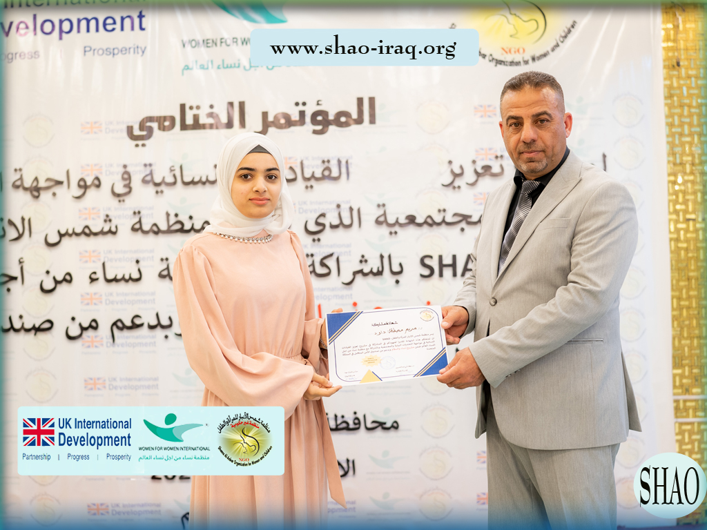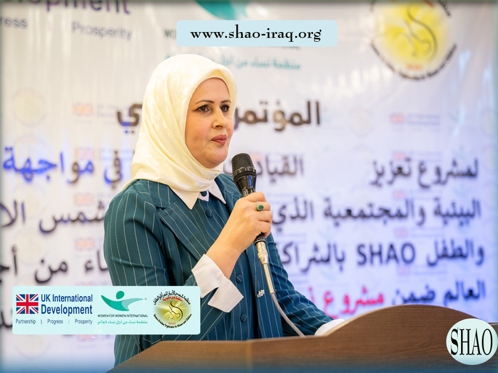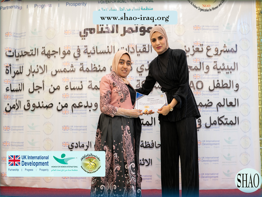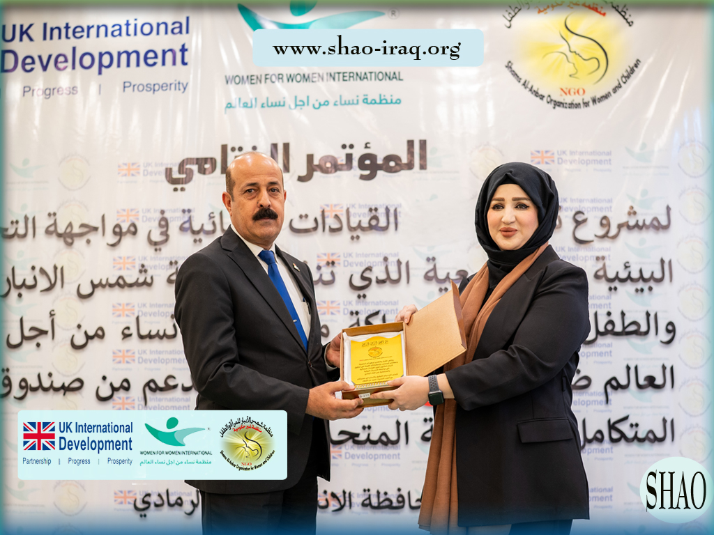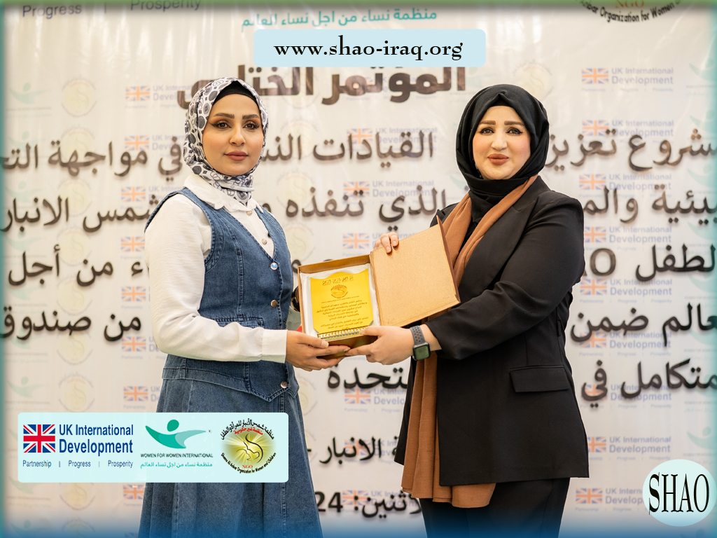 In the presence of official figures, civil society representatives, and a select group of women leaders, the Shams Al-Anbar Organization for Women and Children (SHAO), in partnership with the international organization Women for Women, concluded the closing conference of the project “Strengthening Women’s Leaderships in Confronting Environmental and Societal Challenges.” This project falls within the “Women and Peace” project, supported by the Integrated Security Fund in the United Kingdom.