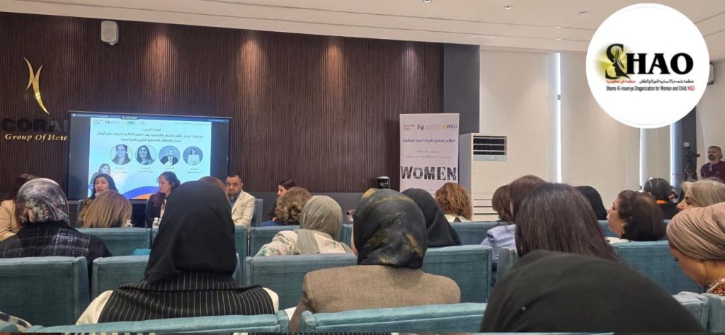 Shams Al-Insaniya Organization for Women and Children participated in the opening of the National Conference of the Iraqi Women’s Network, held under the slogan “Rights, Equality, and the Empowerment of Women and Girls in Iraq.” The conference was attended by a distinguished group of women leaders and advocates from the Network, as well as prominent human rights activists and academics, aiming to support women in the upcoming phase in light of a new legislative council.