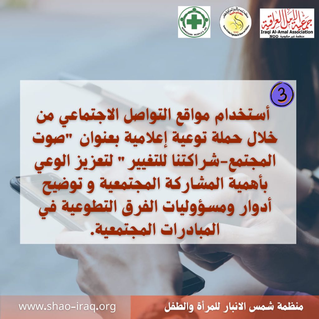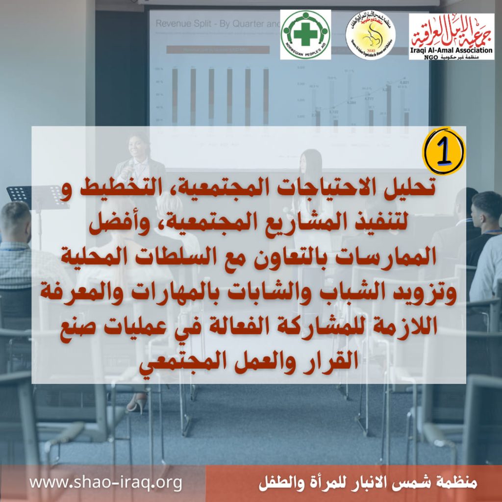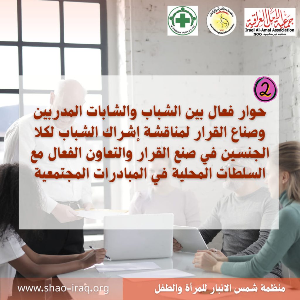 The “Partnership Horizons” project, implemented by “Shams Al-Anbar Organization for Women and Children” with the support of “Iraqi Al-Amal Association” and “Norwegian People’s Aid (NPA)”, aims to enhance youth participation in decision-making and community activities to raise awareness and solve community problems.